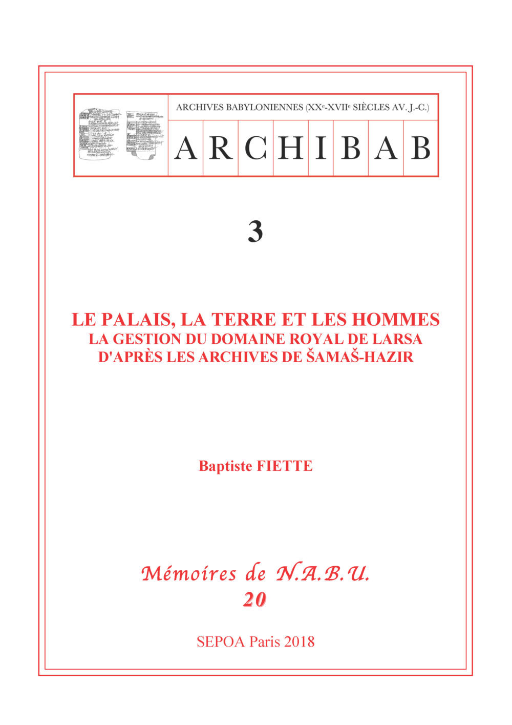 B. Fiette, Archibab 3. Le Palais, la terre et les hommes. La gestion du domaine royal de Larsa d’après les archives de Šamaš-hazir, Mémoires de N.A.B.U. 20, Paris, 2018.
